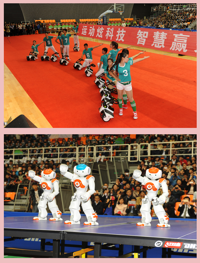 比赛在我校体育中心举行,开幕式由郑锋副院长主持,孙玉坤院长致欢迎词。国家体育总局社会体育指导中心副主任、中国机器人运动工作委员会副主任张怡,中国机器人运动工作委员会执行委员会主任、神州通信集团总经理何晨光教授分别代表国家体育总局体育指导中心、中国机器人运动工作委员会执行委员会致辞。中国自动化学会机器人竞赛工作委员会名誉主席孙增圻教授以及省教育厅、省体育局、省科协、省自动化学会、神州通信集团等单位领导出席了开幕式。开幕式上,我校自编自导的空中机器人队列表演,NAO机器人舞蹈表演精彩纷呈,而机器人平衡车花式队表演更是将开幕式推向高潮。