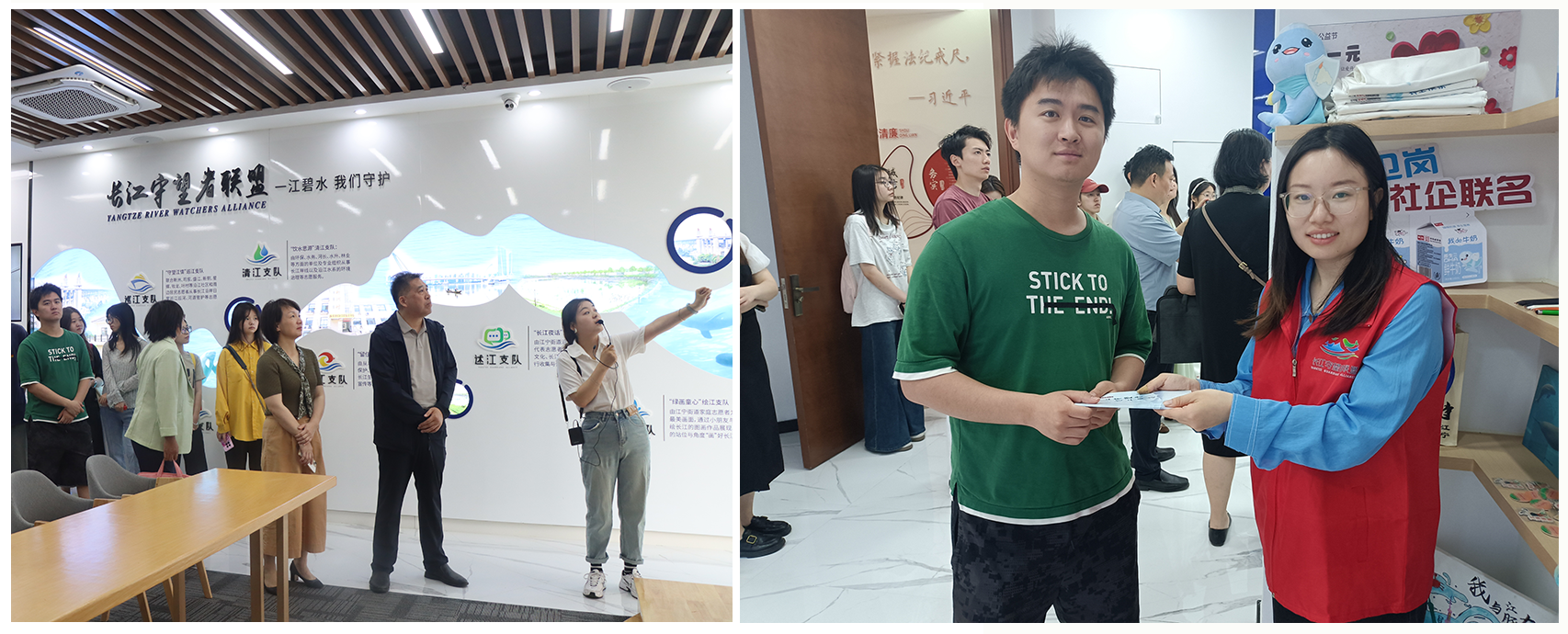 活动现场,与会人员参观了长江守望者联盟之家,深入了解了长江岸线治理、生态修复及志愿服务中的创新举措与成效。联盟志愿者代表还向学生赠送了《长江守望者日志》实践手册,这本由志愿者手记、巡江路线图汇编而成的“移动课堂”,将成为后续思政实践课程的重要学习资料。