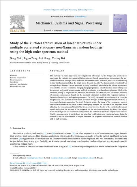 近日,我校汽车与轨道交通学院崔嵩老师作为第一作者、通讯作者,臧利国教授、洪磊副教授、柏宇星博士为合作者,凯发k8官网作为第一单位,在国际权威期刊《Mechanical Systems and Signal Processing》上发表了题为“Study of the kurtoses transmission of linear structures under multiple correlated stationary non-Gaussian random loadings using the high-order spectrum method”的学术论文。该期刊是Elsevier旗下工程技术类顶级期刊,是中科院工程技术一区TOP期刊,专注于发表机械工程领域的新进展,影响因子7.9。