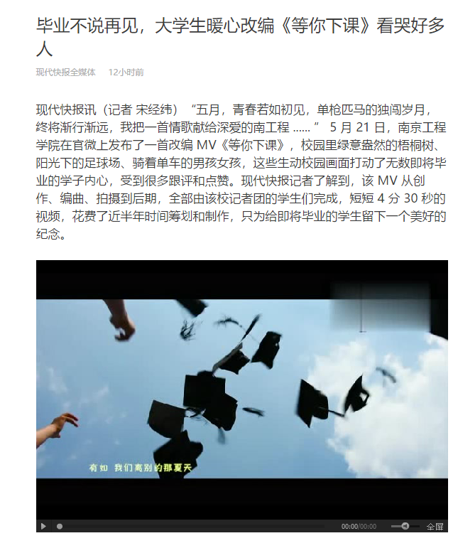 《现代快报全媒体》:毕业不说再见,大学生暖心改编《等你下课》看哭好多人