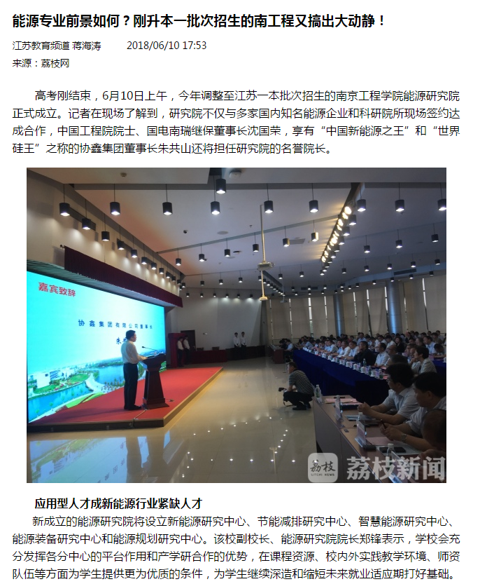 能源研究院成立现场就吸引了协鑫集团有限公司、中国能源建设集团江苏省电力设计院有限公司、国电南京自动化有限公司、中国华能集团公司江苏分公司、国家电投江苏电力有限公司、华润电力控股有限公司江苏大区、南京汽轮电机(集团)有限责任公司、新疆金风科技股份有限公司等八家大型企业的加盟。协鑫集团董事长朱共山表示,当前,传统能源向清洁能源和可再生能源转型已是大势所趋,因此新能源专业优势明显,发展空间巨大,与南工程的合作将进一步推进企业的科技创新、转型升级和绿色发展,他当场表示将捐资1000万元用于能源专业学科建设和人才培养,以推动“以电代煤、以电代油、电从远方来、来的是清洁电”的电能替代、清洁替代、减少碳排放,实现绿色低碳环保发展,积极地发挥作用。