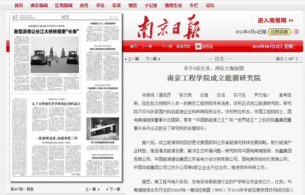 《南京日报》:牵手9家企业,两位大咖加盟 凯发k8官网成立能源研究院