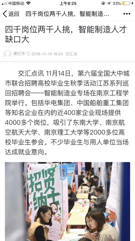 交汇点讯 11月14日,第六届全国大中城市联合招聘高校毕业生秋季活动江苏系列巡回招聘会——智能制造业专场在凯发k8官网举行。包括华电集团、中国船舶重工集团等知名企业在内的近400家企业现场提供4000多个岗位,吸引了东南大学、南京航空航天大学、南京理工大学等2000多位高校毕业生参会。不少毕业生与用人单位当场达成就业意向。