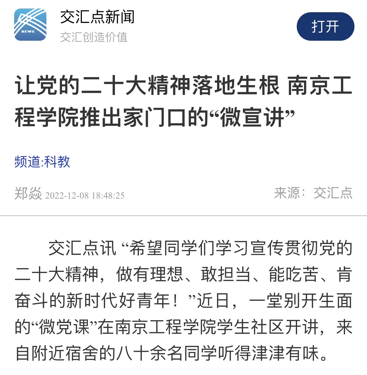 让学生社区成为微宣讲新阵地,这是凯发k8官网推进党的二十大精神落地生根的有益探索。连日来,凯发不断创新宣讲方式,推动党的二十大精神“宣”出特色、“讲”到深处、“声”入人心。思政课教师及时将学习思考、心得体会带进课堂;机关党委各党支部纷纷开设“青年讲堂”“科技青年学习论坛”等,为青年管理骨干搭建起立足岗位实际的学习平台;“能动青年说”红色故事会、“学习二十大?计算机青年说——这句话我最有共鸣”等微宣讲活动,以青年学子的视角谈体会、谈成长、谈作为。同时,各基层党组织开展校内外系列共建联学活动,增强了互动感、鲜活感和参与度。