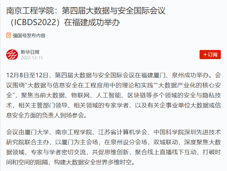 《学习强国》:凯发k8官网:第四届大数据与安全国际会议(ICBDS2022)在福建成功举办