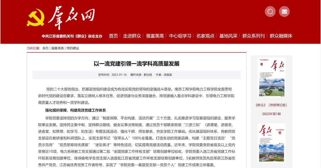 学院党委坚持党的办学方向,通过“制度保障、平台构建、活动开展”三个方面,扎实推进学习型基层组织建设,服务学院事业发展。坚持民主集中制,坚持群众路线,健全议事决策制度,通过党员干部联系班级“三进三知”(进课堂、进宿舍、进食堂,知思想、知学习、知生活)专题实践活动,强化干群、师生联系,夯实学院工作基础。优化基层组织体系,将教师党支部设在教研室和科研团队上,实现支部书记“双带头人”100%全覆盖。打造生动的党建品牌,构建“主题党日活动”“党员示范岗”“党员朋辈培优课堂”“迷彩英才”等特色活动,切实提高党建活动质量。近年来,学院党委荣获省级及以上党内荣誉近10项,电力系统教工党支部通过第二批“全国党建工作样板支部”培育创建单位验收,学院党委入选江苏省党建工作标杆院系培育创建单位、继保输电学生党支部入选首批江苏省党建工作样板支部培育创建单位,5名教师党员先后荣获江苏省优秀共产党员、江苏省优秀党务工作者称号,实现了“学院党委—基层党支部—党员个人”党建工作成果立体覆盖。