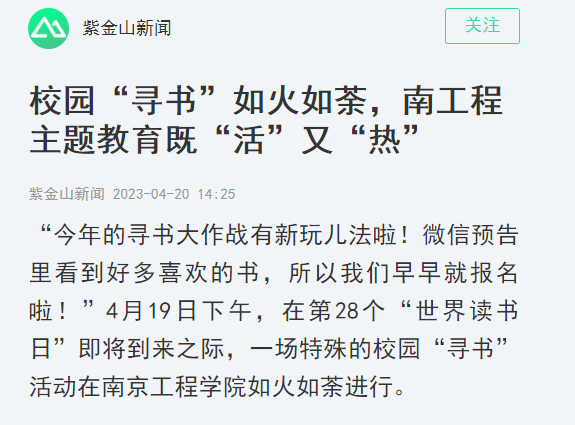 《紫金山新闻》:校园“寻书”如火如荼,南工程主题教育既“活”又“热”
