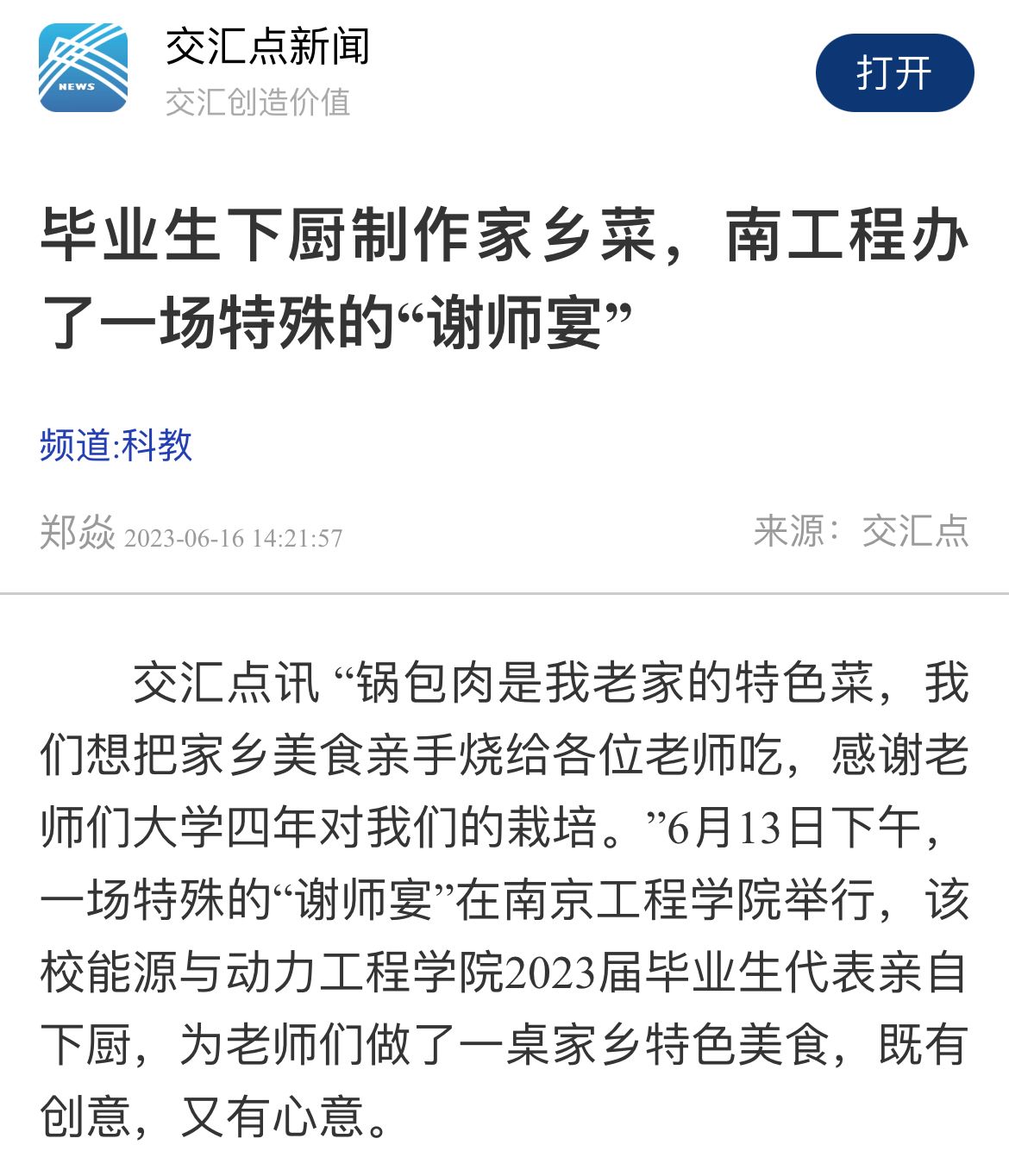 交汇点讯“锅包肉是我老家的特色菜,我们想把家乡美食亲手烧给各位老师吃,感谢老师们大学四年对我们的栽培。”6月13日下午,一场特殊的“谢师宴”在凯发k8官网举行,该校能源与动力凯发2023届毕业生代表亲自下厨,为老师们做了一桌家乡特色美食,既有创意,又有心意。