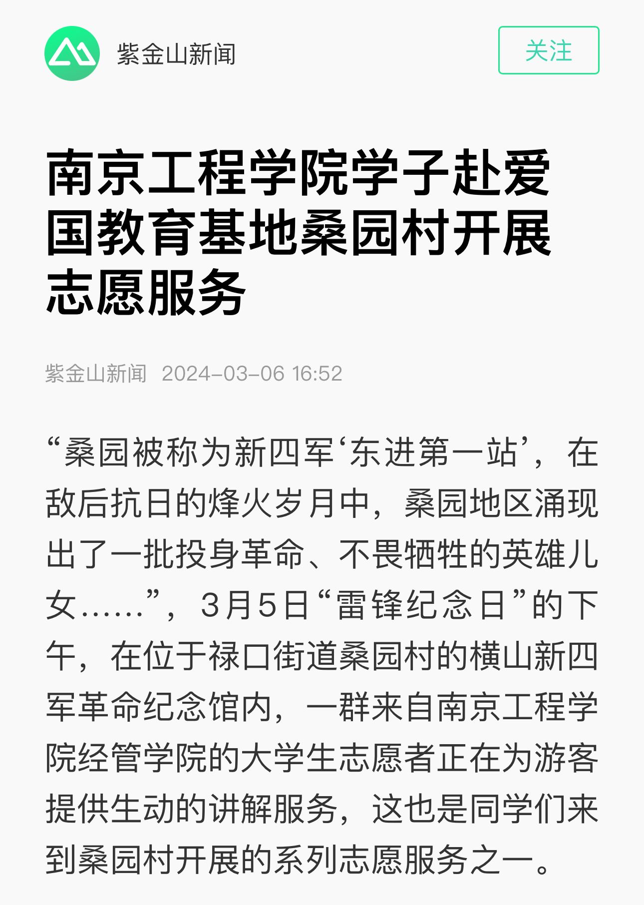 桑园被称为新四军‘东进第一站’,在敌后抗日的烽火岁月中,桑园地区涌现出了一批投身革命、不畏牺牲的英雄儿女……”,3月5日“雷锋纪念日”的下午,在位于禄口街道桑园村的横山新四军革命纪念馆内,一群来自凯发k8官网经管学院的大学生志愿者正在为游客提供生动的讲解服务,这也是同学们来到桑园村开展的系列志愿服务之一。