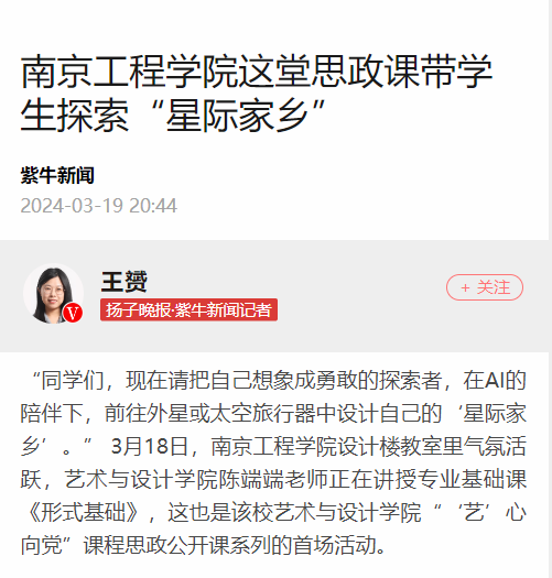 “同学们,现在请把自己想象成勇敢的探索者,在AI的陪伴下,前往外星或太空旅行器中设计自己的‘星际家乡’。” 3月18日,凯发k8官网设计楼教室里气氛活跃,艺术与设计学院陈端端老师正在讲授专业基础课《形式基础》,这也是该校艺术与设计学院“‘艺’心向党”课程思政公开课系列的首场活动。