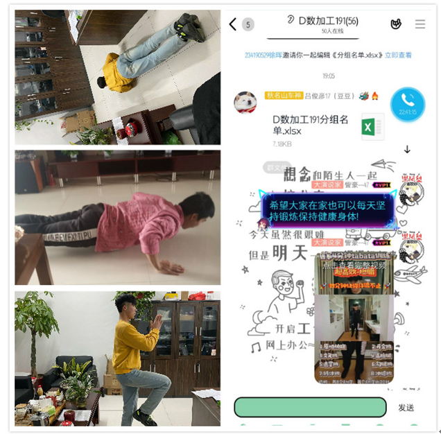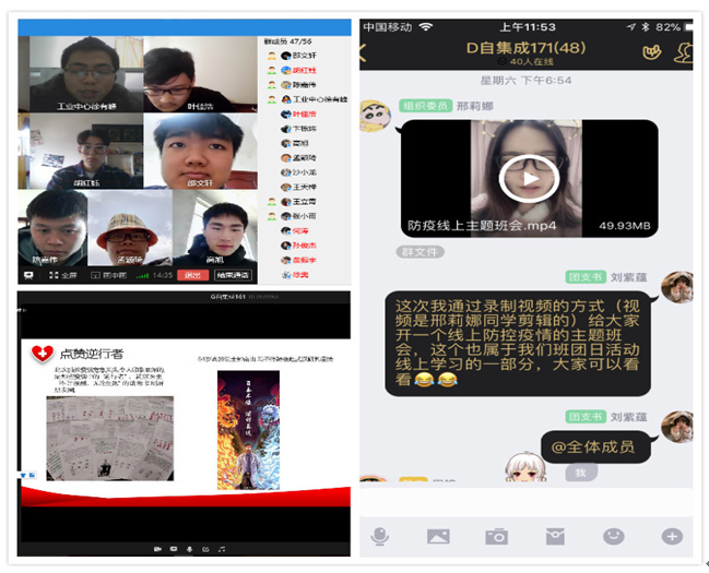 各团支部引导同学们通过“线上打卡”“云端分享”等互相督促、互相监督,形成“宅家不断线”的学习氛围。D自集成171团支部通过创建“英语学习群”“线上笔记分享”等,在班级里营造“不断线”的学习氛围。D数加工191团支部在班级群里定期分享“宅生活”的精彩瞬间,展现了同学们在家丰富的学习和休闲生活。毕业班团支部纷纷利用QQ课堂,在“云端”分享招聘信息,班主任们化身“主播”,在线“支招”。