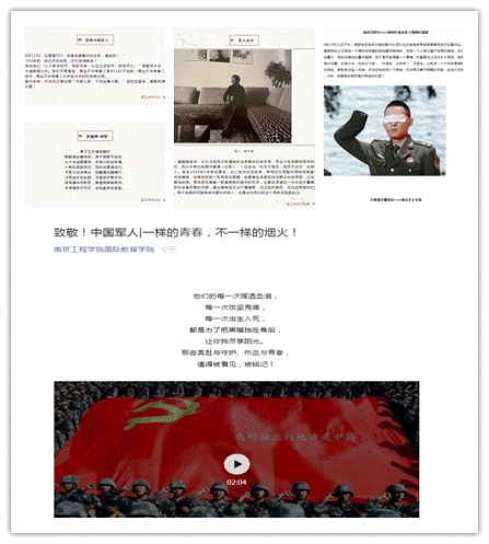 活动开展一个月以来,同学们踊跃参与,积极投稿,用多种形式宣传国防建设方针政策,颂扬爱国拥军、献身国防先进典型的感人事迹。软工中外191于润童同学以《军人老辛》为题,讲述了身边的一位老兵参加抗日战争、解放战争的艰苦历程,军人的家国情怀跃然纸上。软工中外182班徐浩玮、软工中外192班李希润分别以诗歌的形式讴歌了在抗击新冠病毒期间军人闻令而动、冲锋在前,以最坚定的意志、最无畏的气概、最顽强的作风,与时间竞速,与病毒抗争,持续奋战在疫情防控第一线。软工中外181班李顶、软工中外191班袁筱钰则以微视频的形式歌颂杜富国、张富清、王伟、四川山火中牺牲的18名年轻的消防队员等无数应该被人们永远铭记的英雄人物。学院相关负责人表示,将努力探索中外合作办学下国防教育新的形式、方法和途径,扎实有效地把国防教育与校园活动有机结合起来,不断提升国防教育的质量和实效。