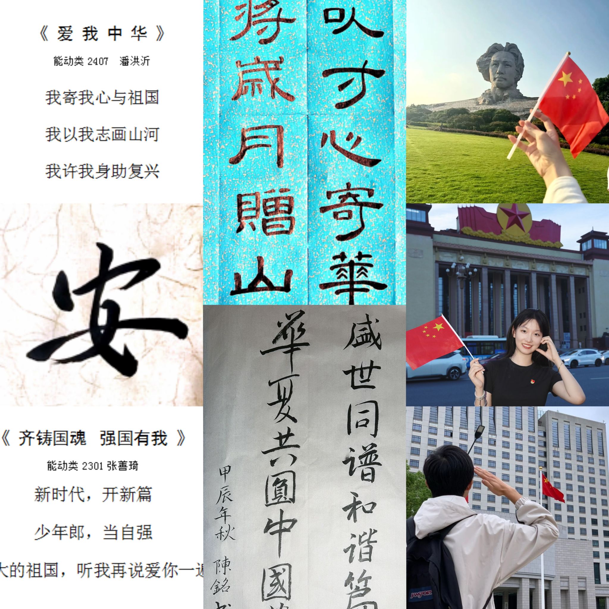 “青春·活力”展风采。为鼓励广大团员青年创新形式,用独特的方式为祖国送上最美的祝福,9月28日—10月7日,学院面向全体师生发布“国庆‘征’精彩,共绘中国梦”作品征集活动,从“我和国旗合个影”“我为祖国写首诗”“我向祖国展才艺”“我同祖国忆岁月”四个角度收集青年学生对祖国的热爱和祝福,通过拍照、写诗、做手工等形式,加强同学们对红色历史记忆、中华优秀传统文化、新中国重大成就等内容的思考与体悟。“我寄我心与祖国,我以我志画山河,我许我身助复兴!”能动类2407班潘洪沂用一首三行情诗为祖国母亲庆生,并表示将努力学习、扎实技能,展现新时代青年的风采与担当。